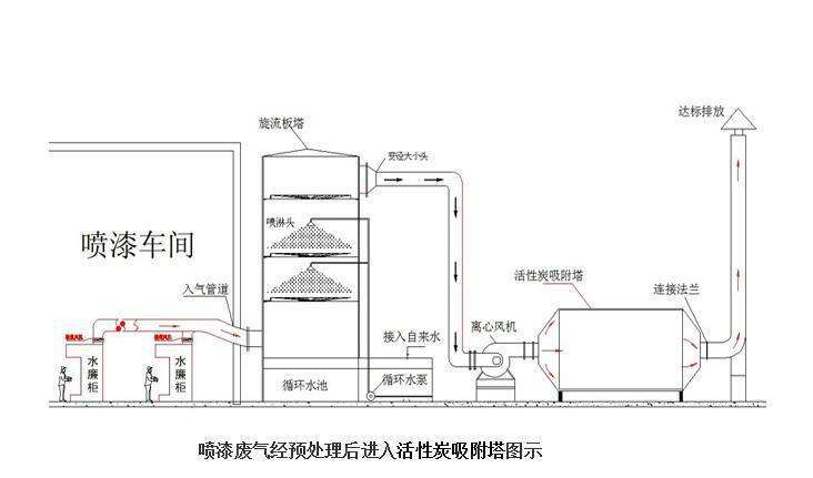 廢氣經過吸附塔內的初效過濾器除去固體顆粒物后,進入塔體,經過活性炭層吸附后,除去氣體中的有機廢氣分子,達到符合排放標準的凈化氣體,經風機排到室外。